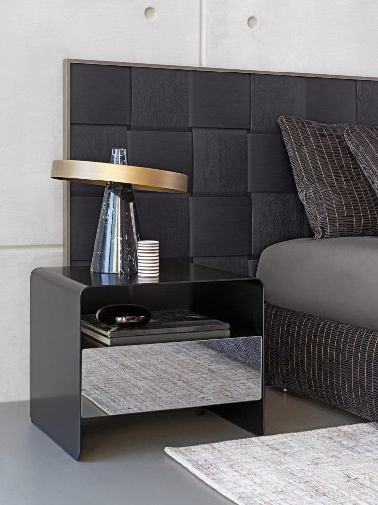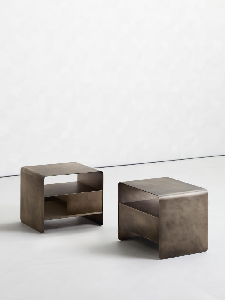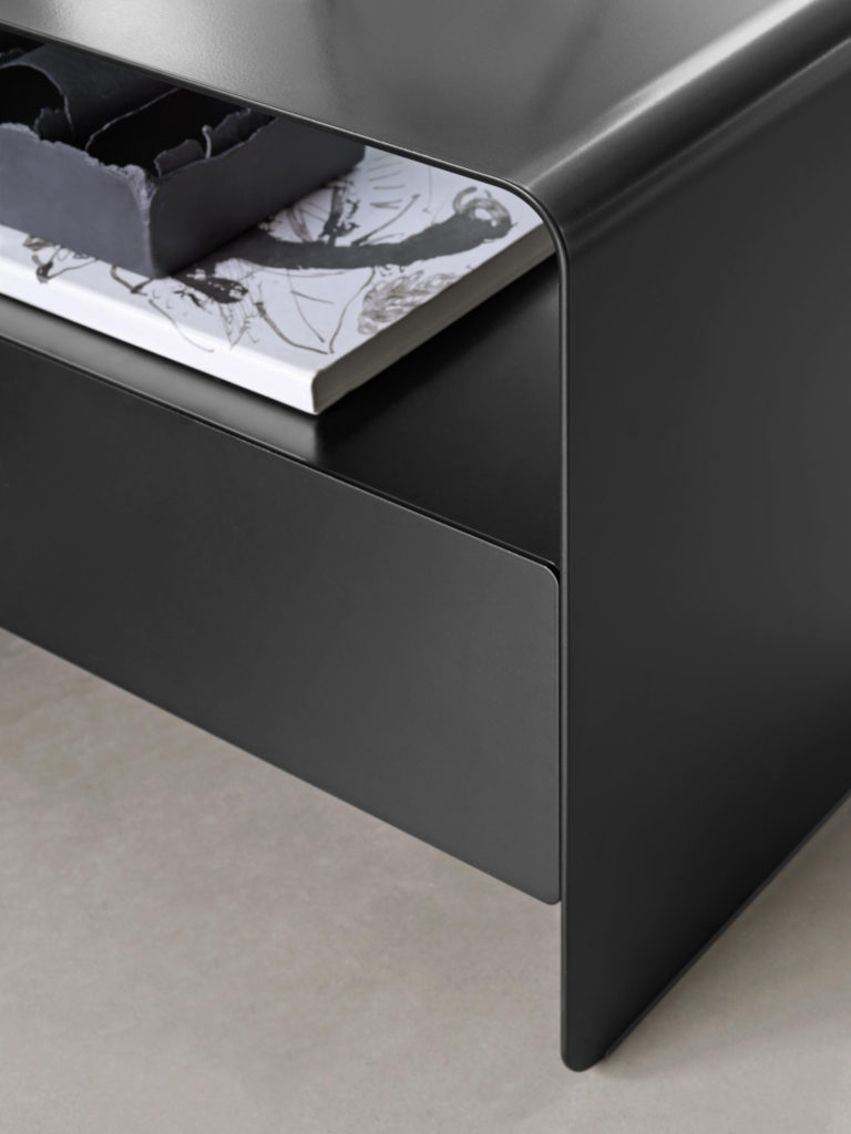 Una semplice lastra di metallo con finitura brunito opaco, oxide o nero curvata in modo armonico, all’interno della quale trova il suo spazio, quasi in sospensione, un contenitore con cassetto e piano di appoggio. Il cassetto può avere il frontale nella stessa finitura della struttura o in materiali diversi: in grès porcellanato nei colori Concrete e Liquorice oppure a specchio fumé o bronzato.