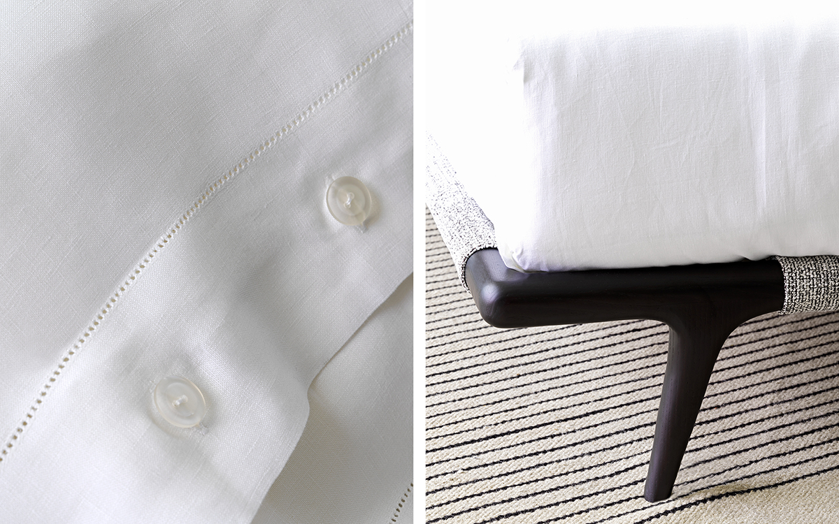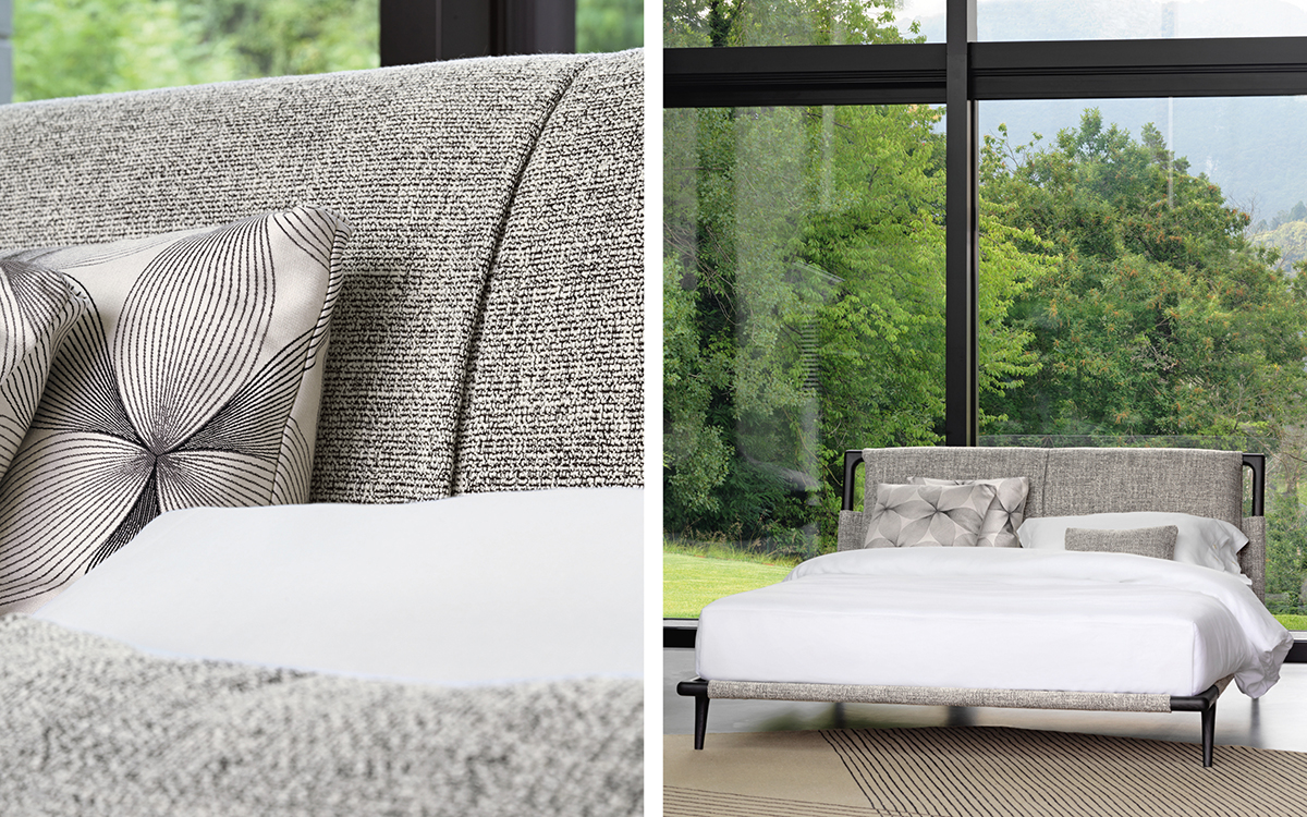 La testata e i piedi di appoggio in massello, nelle finiture rovere caffè o rovere tinto nero, sono il risultato di preziose lavorazioni artigianali e creano un’impalcatura sinuosa pronta ad accogliere il rivestimento in tessuto, pelle o Ecopelle.