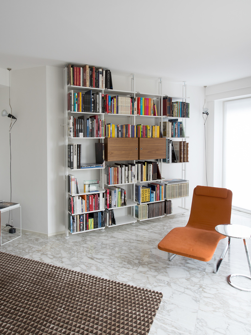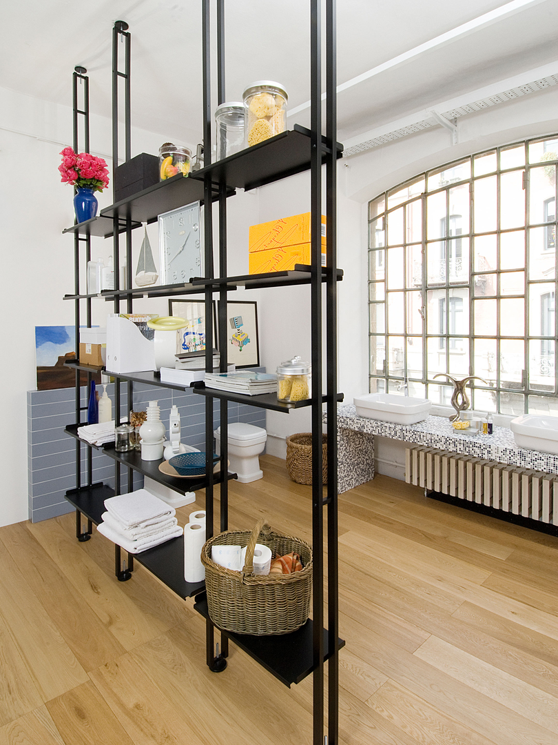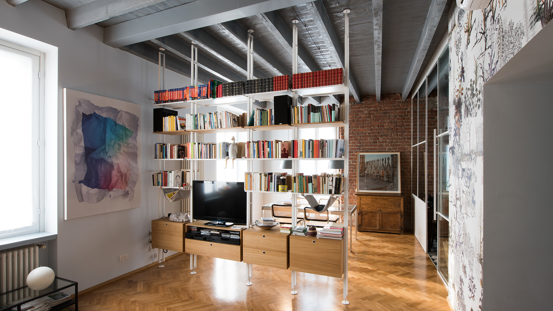 I montanti verticali in alluminio fissati a pressione tra il pavimento e il soffitto, abbinati a ripiani e diversi tipi di contenitori, permettono di creare soluzioni d’arredo adatte in ogni ambiente della casa, dalla zona giorno alla zona notte.