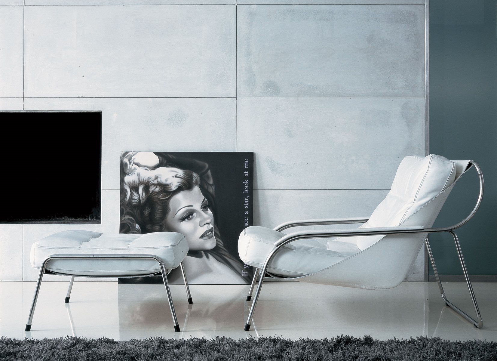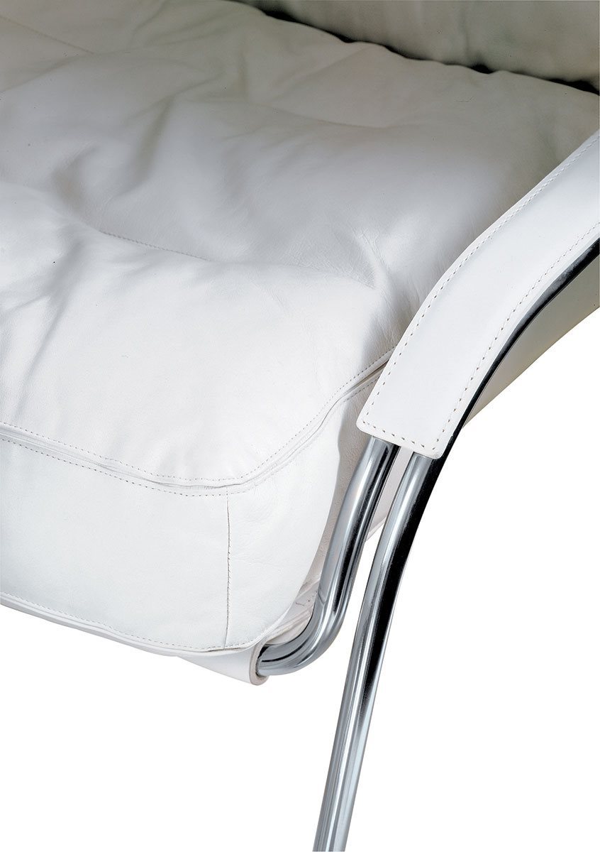 La chaise longue firmata Marco Zanuso. Struttura in acciaio inox 18/8 lucidato, o nichelsatinato colore naturale o nero, oppure verniciato nero. Scocca in cuoio pigmentato 90. Imbottitura cuscino schienale in piuma d’oca. Imbottitura cuscino seduta in poliuretano/ Dacron Du Pont. Rivestimento, cuscini e braccioli in Ecofire o pelle.