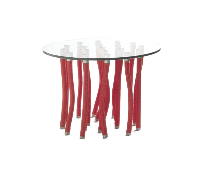 Allo sguardo, il tavolino Org di Fabio Novembre propone il paradosso di un piano che pare elevarsi su elementi che pendono dall’alto, come viticci: la solidità dell’insieme è celata alla vista ed è dovuta all’alternarsi di gambe movibili realizzate in corda polipropilenica con gambe rigide dotate di anima in acciaio e rivestimento in corda.